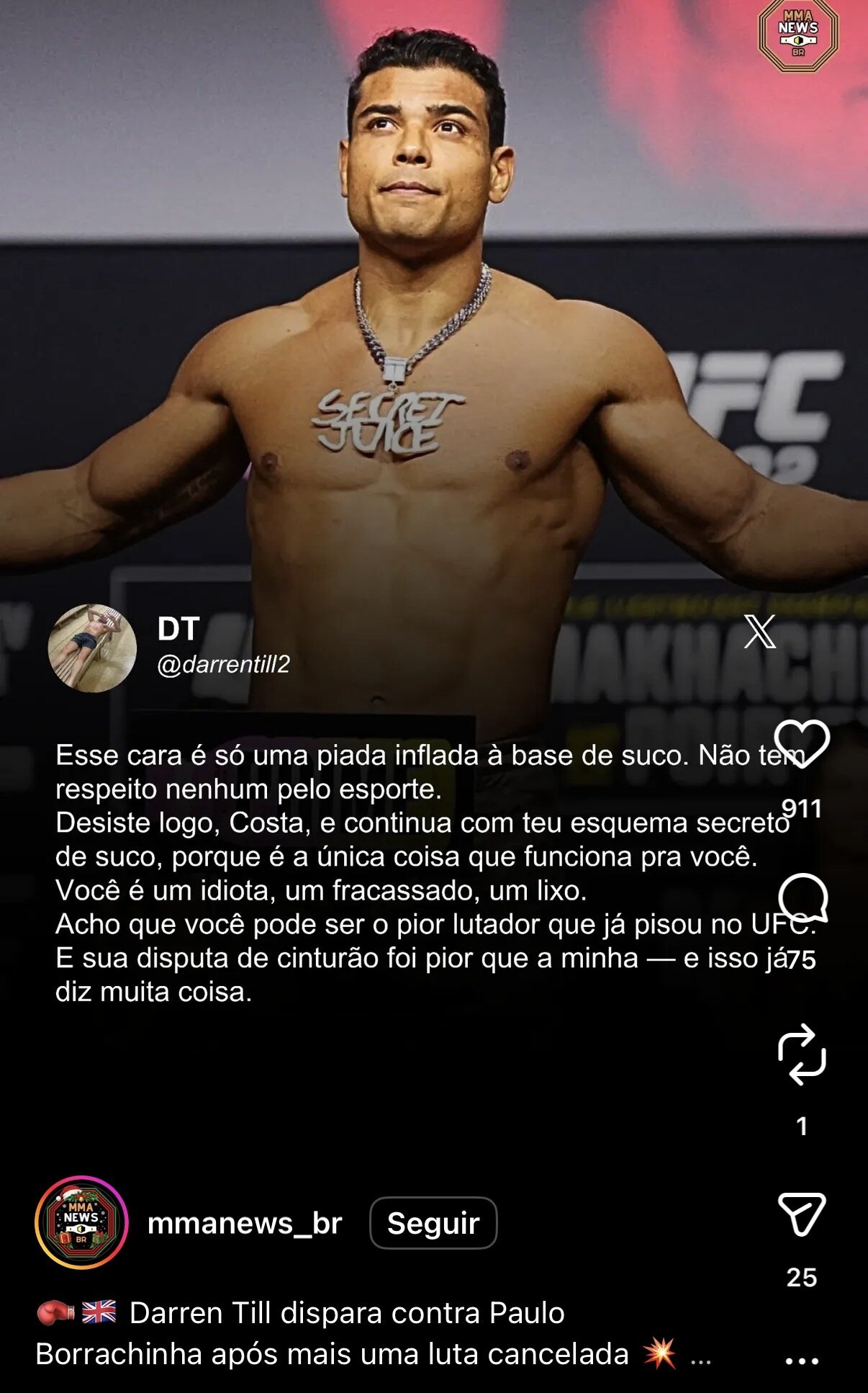 afterforever 0 Posted December 29, 2025 3 horas atrás, pipo disse: Ciclo acho que não pq essa galera é testada a toda hora mesmo fora de período de luta marcada é pq é um babaca mesmo, viu no Huck uma ameaça que se ele vence não leva o Borracha a nenhum canto no ranking. grande risco, pouco retorno só que ele faz há anos Acho que ele não achou boa a proposta,iria se arriscar com um cara bom e fora do ranking... Ele acha que o UFC só vai dar as melhores opções pra ele o tempo todo. Sempre um papo do tipo "eu mereço mais". Só que pra continuar crescendo precisa lutar... Holloway fez uma porrada de luta pra crescer de patamar,Charles tbm... Borrachinha foi deixando o tempo passar recusando e cancelando lutas e está aí.... Não é tão jovem mais e perdeu muitas oportunidades... Não são só os cancelamentos, é o tempo sem nem marcar luta . Share this post Link to post Share on other sites